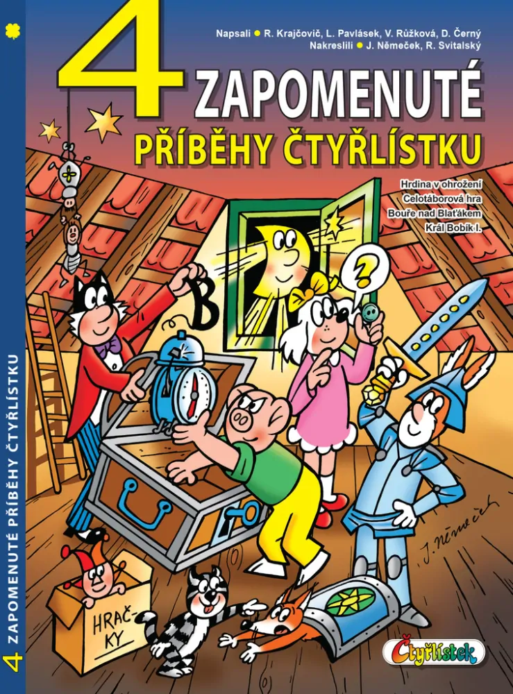 Nová komiksová knížka z oblíbené edice čtyř příběhů přináší další dobrodružství veselé party ze Čtyřlístku. Fifinka, Bobík, Pinďa a Myšpulín v ní zažijí příběhy tentokrát na téma zapomenutých příběhů. Jestlipak už jste doma dělali velký úklid? Ve sklepě nebo na půdě, kde je spousta krabic a v nich odložené věci. Takové, na které se už dávno zapomnělo, ale jsou tam uschovány pro případ, že by se jednou mohly hodit. A přesně to se stane našim kamarádům, když na půdě objeví starou truhlu a v ní čtyři předměty. Škrabošku, meč, knoflík a budík. Díky nim si tak připomenou dávno zapomenuté příběhy jednoho léta.