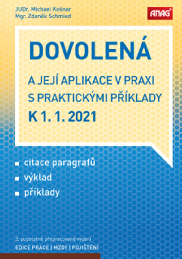 V dostatečném časovém předstihu před nabytím účinnosti změn v právní úpravě dovolené nabízíme čtenářům publikaci autorů Zdeňka Schmieda a Michaela Košnara obsahující podrobný komentář k jednotlivým ustanovením nové koncepce dovolené včetně řady příkladů pro jejich snadnější aplikaci v praxi. Svým vnitřním členěním publikace systematicky navazuje na předchozí příručky týkající se dovolené.