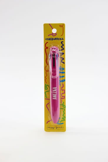 Osmibarevná propiska se jménem či originálním nápisem nesmí chybět v žádném penálu! Propiska píše těmito barvami: černá, hnědá, růžová, fialová, červená, oranžová, zelená a modrá.
