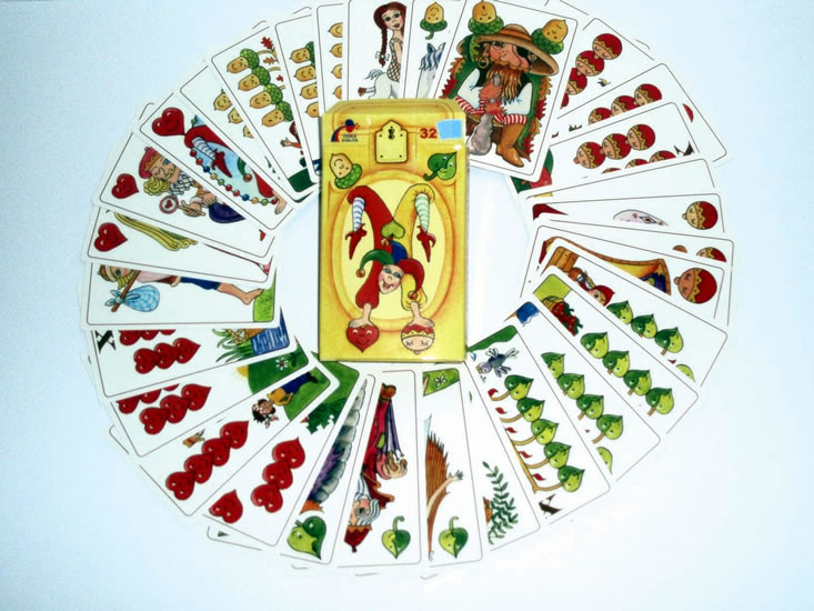Dětské karty pro hru zvanou "Prší". Krabička obsahuje i podrobný návod a karty mají na rubové straně mírně zdrsnělý povrch pro lepší manipulaci s nimi.