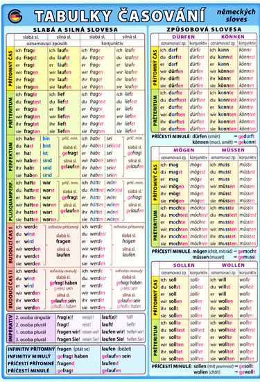 Přehledné tabulky všech německých časů sloves slabých, silných, způsobových a pomocných. Obsahuje oznamovací způsob, konjunktiv, imperativ, neurčité slovesné tvary, barevné značení koncovek a nepravidelností.