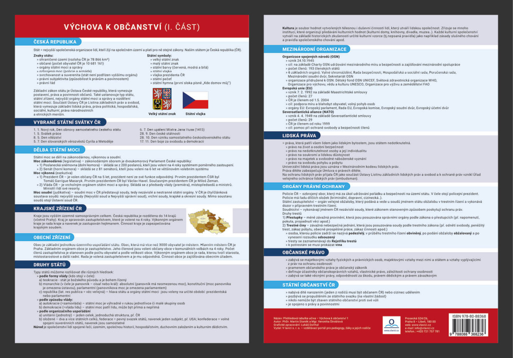 Přehledně zpracované učivo předmětu výchovy k občanství, autoři shrnují témata, se kterými se žáci setkávají ve vyučování v souladu s RVP ZV. (Česká republika, státní svátky, dělba stání moci, kraje ČR, Druhy států, mezinárodní organizace, lidská práva a tolerance, občanské právo). Přehledová tabulka učiva slouží pro žáky druhého stupně základní školy.