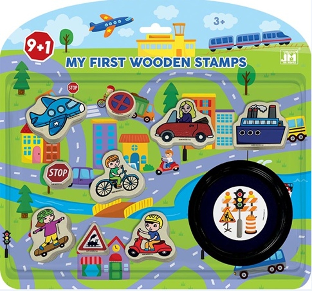 Set obsahuje celkem 9 razítek různé velikosti a modrou inkoustovou podušku v oblíbených dětských motivech.
