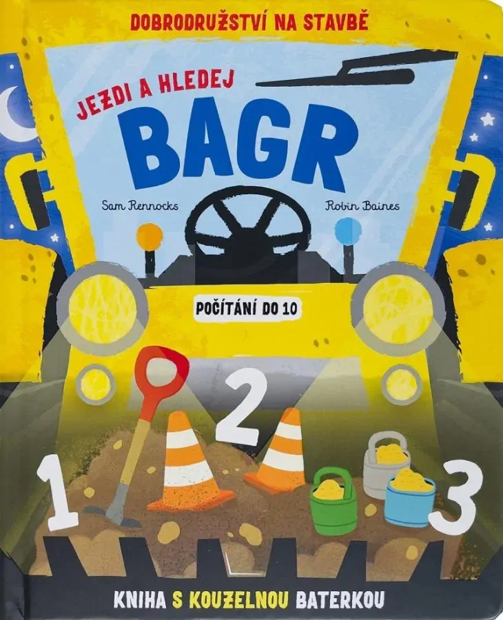 Nauč se počítat do 10 s touto interaktivní knihou s kouzelnou baterkou! Posaď se za volant a projeď se s bagrem po staveništi. Otáčej volantem na každé stránce, posviť si na cestu, hledej a počítej předměty, které v kuželu světla objevíš. Zvládneš je ve tmě všechny najít?