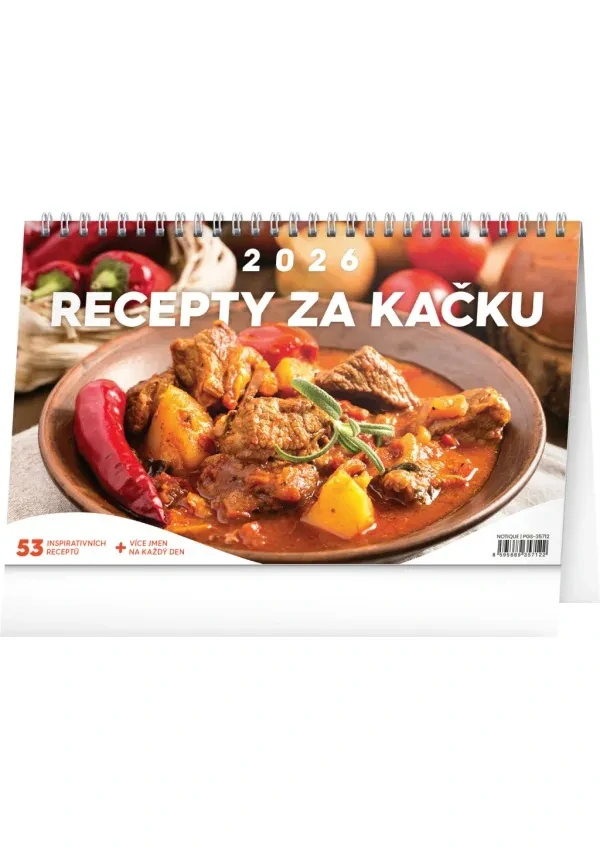 Zajímá vás, jak uvařit chutné a jednoduché jídlo? Stolní kalendář Recepty za kačku nabízí 53 takových tipů! Sami se budete moci přesvědčit, že vařit se dá chutně a zároveň levně. Týdenní kalendárium s prostorem pro poznámky obsahuje také svátky, památné dny, měsíční fáze a přehled na celý rok 2026 a 2027.