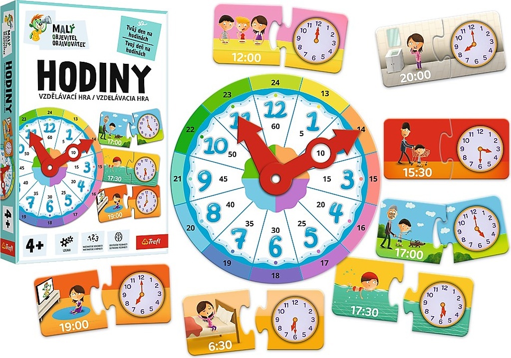Vzdělávací skládačka, která pomáhá poznat fungování hodin a učí přiřadit různé činnosti příslušným částem dne. Rozvíjí schopnost plánování, základní matematické schopnostii. Věk 4+