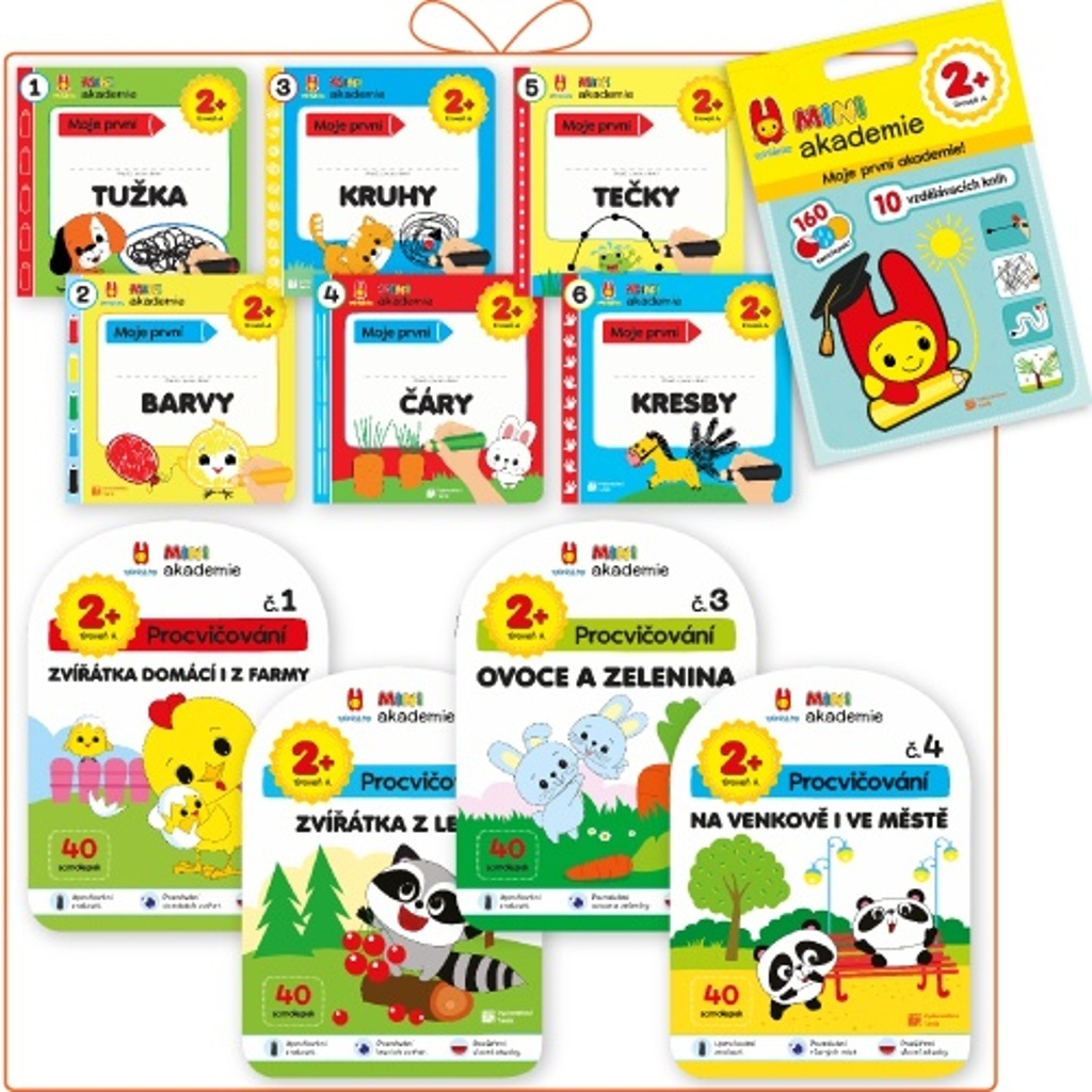 MINI akademie je ucelený moderní systém učení, který sestavili odborníci na předškolní vzdělávání. Skládá se ze tří učebních balíčků pro 3 věkové skupiny: pro dvouleté, tříleté a čtyřleté děti. Hlavním rysem je srozumitelný obsah, který vede dítě od prvních pokusů kresby až po nezávislé řešení různých aktivit. Všechny tři úrovně se skládají z šesti knih s aktivitami a čtyř pracovních sešitů se samolepkami.