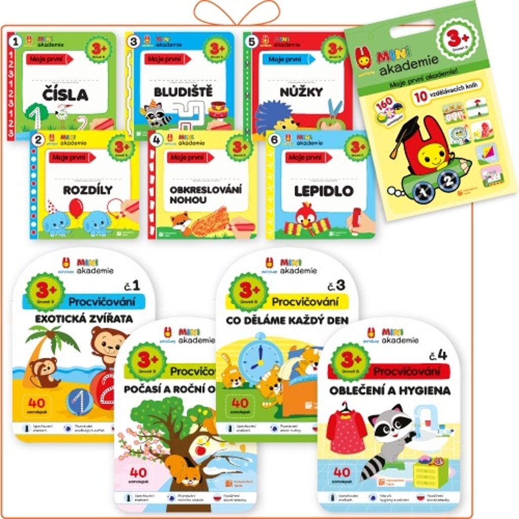 MINI akademie je ucelený moderní systém učení, který sestavili odborníci na předškolní vzdělávání. Skládá se ze tří učebních balíčků pro 3 věkové skupiny: pro dvouleté, tříleté a čtyřleté děti. Hlavním rysem je srozumitelný obsah, který vede dítě od prvních pokusů kresby až po nezávislé řešení různých aktivit. Všechny tři úrovně se skládají z šesti knih s aktivitami a čtyř pracovních sešitů se samolepkami.