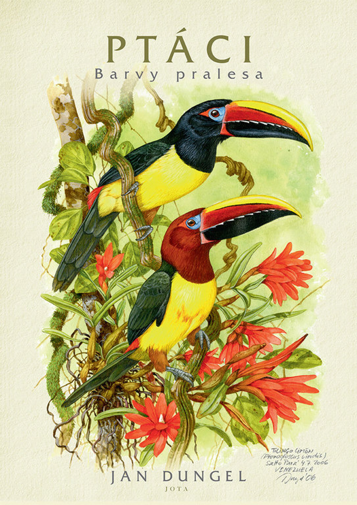 Malíř a přírodovědec Jan Dungel se věnuje dokumentaci tropické přírody Jižní Ameriky přes třicet let. V době všudypřítomné fotografie jako jeden z mála navazuje na tradici malířů 19. století, kteří se účastnili přírodovědeckých výprav. V amazonských pralesích, pod zasněženými vrcholy And či v nejrozsáhlejších mokřadech na Zemi Pantanal a Los Llanos tráví každoročně několik měsíců, aby ve skicáři zachytil fascinující svět živočichů a rostlin. Jeho kniha představuje portréty neotropických ptáků, které vznikaly přímo v terénu, často za obtížných podmínek a dobrodružných situací, které popisuje autentický text jeho deníků.