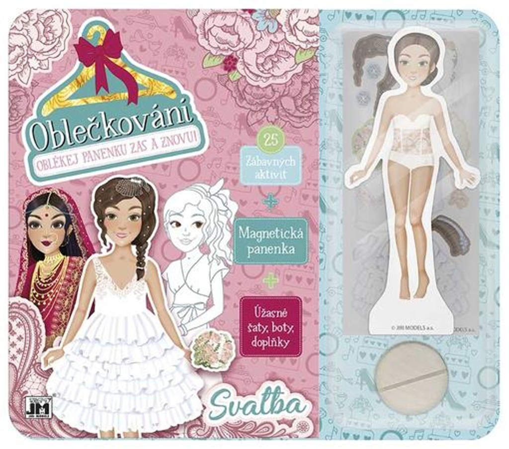 Set obsahuje 25 stránek plných módních aktivit i omalovánek, magnetickou panenku a spoustu magnetických částí (šaty, boty, doplňky) s motivem svatby.