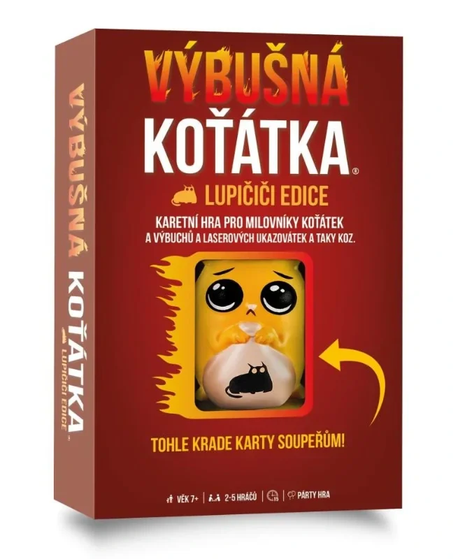 Tato speciální edice Výbušných koťátek obsahuje všechny karty z originální hry Výbušná koťátka a ňuňací LUPIČIČI! Přesuňte tuhle LUPIČIČI k jinému hráči a ukradněte mu jeho cennou kartu. Mějte se však na pozoru, protože být mimořádným lupičem znamená být mimořádnou obětí! Pár informací o populární hře Výbušná koťátka: Výbušná koťátka (Exploding Kittens) od autorů Elana Lee, Matthew Inmana a Shane Smalla je historicky nejúspěšnější hra na Kickstarteru, která v roce 2015 změnila historii crowdfundingových kampaní, když na její vznik přispělo přes 219 000 lidí. Hra Výbušná koťátka je kočičí verzí Ruské rulety. Hráči se zde střídají v tazích, během kterých si dobírají karty, dokud takto někdo neobdrží Výbušné koťátko, čímž končí a je vyřazen ze hry. Balíček karet se samozřejmě skládá též z karet, které vám umožní se výbuchu vyhnout, například tím, že se budete moci podívat na karty předtím, než si je vezmete, přinutíte protivníka vzít si několik karet najednou či zamícháte balíček a mnoho dalších. S každou další kartou je hra napínavější a napínavější, protože, jak se jejich počet v dobíracím balíčku snižuje, zvyšuje se zároveň pravděpodobnost, že si doberete koťátko a efektně se vyhodíte do povětří! Vtipné ilustrace s ještě vtipnějšími texty vás pobaví a plně vtáhnou do hry, kterou budete chtít hrát stále dokola. Každá karta je originál. Pravidla hry jsou velice jednoduchá, vysvětlená za pár vteřin. Tuto verzi hry lze kombinovat i s dalšími hrami z rodiny Výbušných koťátek. Obsah balení: 56 karet, 1 pěnová kočičí figurka, 1 česká pravidla. Počet hráčů: 2-5. Doba hraní: 15 min. Věk: 7+